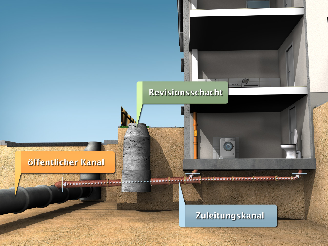 Definition des Zuleitungskanals als Anschlusskanäle zwischen der Übergabestelle am öffentlichen Kanal und der Grundstücksgrenze sowie von der Grundstücksgrenze bis zur ersten Reinigungsöffnung und Grundleitungen, also im Erdreich oder in der Grundplatte unzugänglich verlegte Entwässerungsleitungen, die das Abwasser dem Anschlusskanal zuführen.